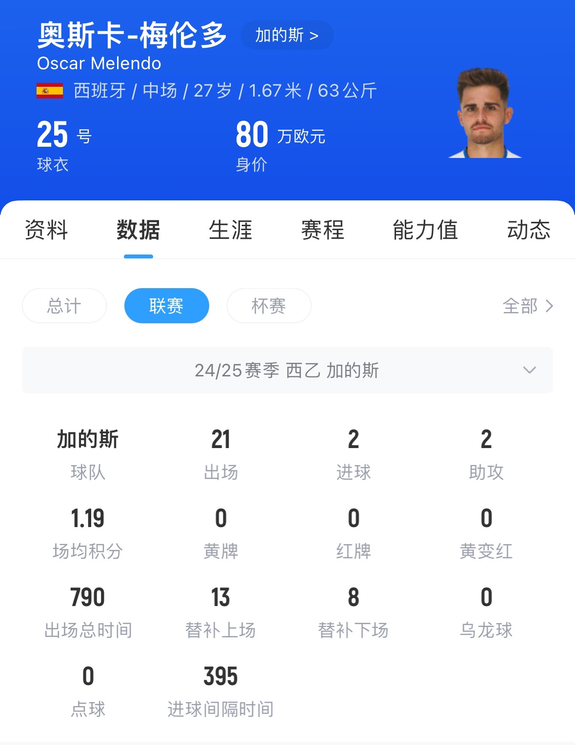 现年27岁的梅伦多24/25赛季效力于西乙加的斯,共出场21次,贡献2球2助,现身价80万欧。